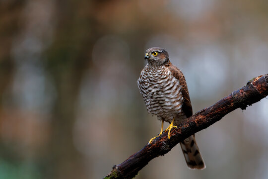 Eurasian Sparrow hawk (Accipiter nisus) sitting on a branch in the forest  in the Netherlands. Dark background