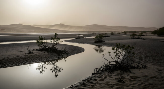 Ethereal desert landscape with rolling sand dunes sparse vegetation and soft morning mist at sunrise