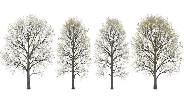isolated deciduous trees early spring with sparse leaves and bare branches on a white background for architectural visualization