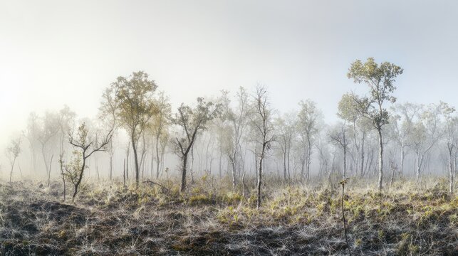 A misty forest landscape with sparse trees and undergrowth, evoking a serene atmosphere.