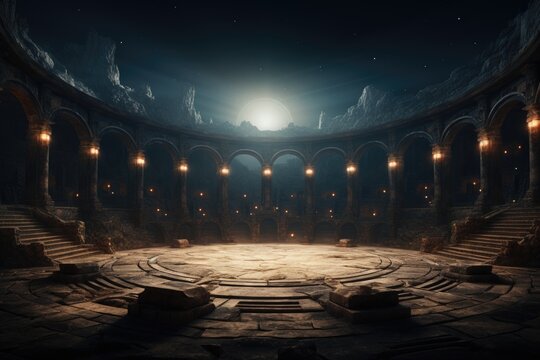 Antique arena podium for battles, marble columns, moon and night, ancient Rome