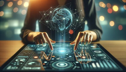 Interactive digital map display with user interface highlighting global data trends and geography in a modern setting