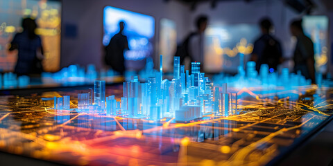 Futuristic hands interacting with holographic 3D map for spatial analysis.