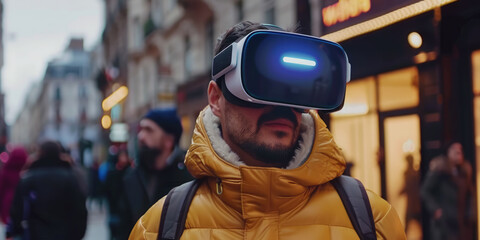 man in virtual reality glasses on a city street, spatial computer, mask, high technology, VR, device, person, people, portrait, online, game, Internet, future, electronic, 3D, three-dimensionally