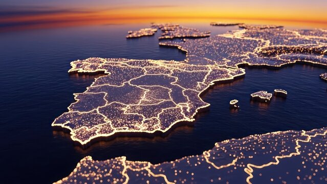 Illuminated map of a European peninsula, glowing against a sunset sky