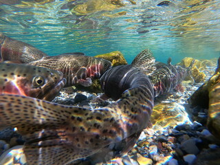 wild, red sockeye salmon spawning in a clear forest stream in Alaska.  These fish have reached the end of their migration from the ocean to their river spawning grounds to lay their eggs