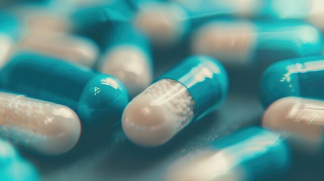 Close-up of blue and white capsules, highlighting their detailed surfaces and colorful blend, emphasizing their pharmaceutical design