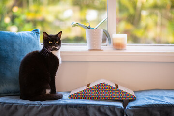 Spherical speckled object casting shadow on sunlit wooden surface