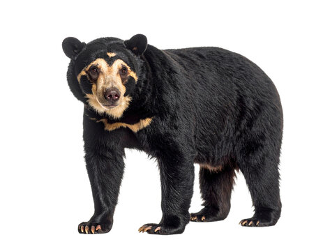 A spectacled bear, angled view, a unique South American bear species, isolated on a white background.