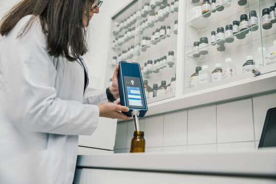 Midsection of female pharmacist using NIR spectrometer in chemist store