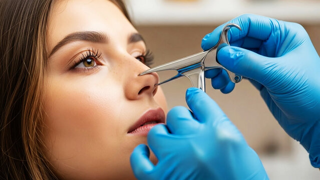 Nasal polyp removal Doctor examines woman's nose with medical speculum in clinic