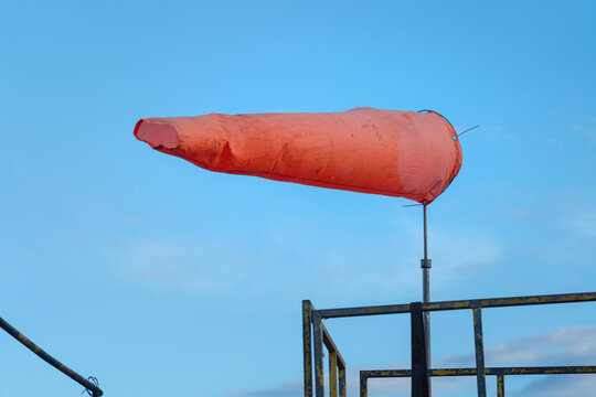 An orange windsock on blue sky background. The equipment using to indication windy speed and direction.