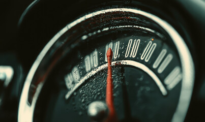 Close-Up of Vintage Speedometer with Red Needle and Water Droplets, Capturing the Essence of Classic Automotive Design and Precision Instrumentation