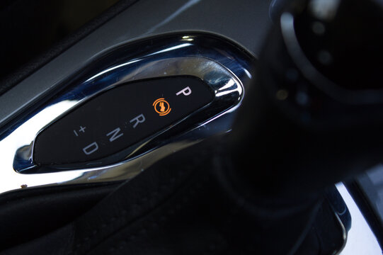 Futuristic vehicle hud displaying auto hybrid electric mode selector with speed gauge