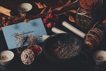 Ancient magic book on a wooden table background. Spellbook
