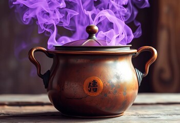 Antique copper pot, bubbling with mystical purple steam,  mystery,  fantasy