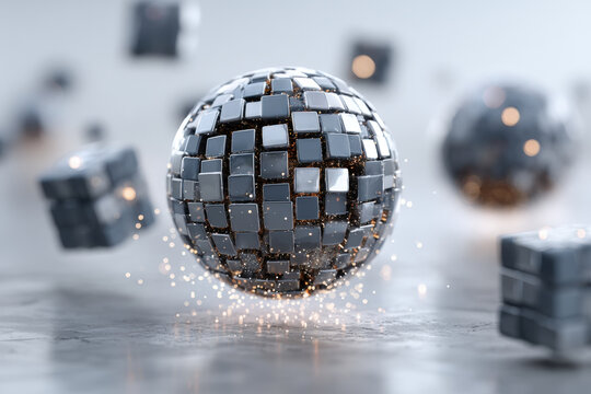 Geometric sphere with colorful cubes, network structure, symbolic connectivity.