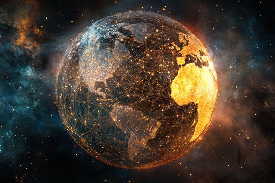 Global network sphere representing abstract data connection and digital technology with nodes and lines, illustrating worldwide communication and futuristic information flow