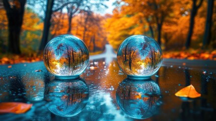 Reflections in glass spheres capturing an autumn road scene with trees and rain on a colorful background