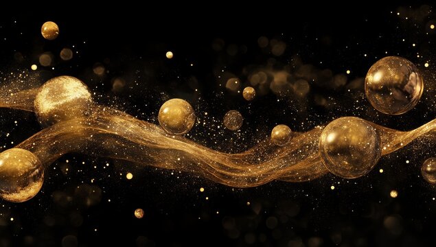 Abstract gold spheres and flowing particles on black background.
