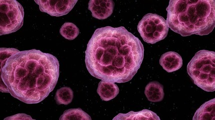 Group of pink-colored spheres floating in the air against a black background. the spheres appear to be spherical in shape and have a rough texture.
