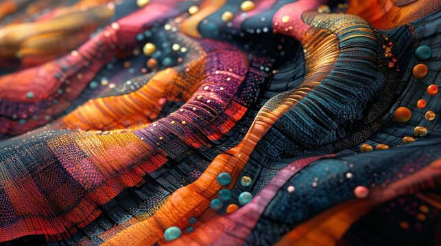 Dynamic abstract pattern of textured fabric in vibrant colors with decorative spherical elements