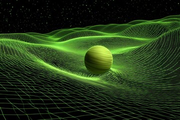 A green grid-like landscape undulates in a digital space, featuring a spherical object resembling a planet at its center.