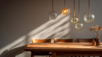 Modern dining room interior featuring a long wooden table, minimalist chairs, and spherical pendant lights, with warm sunlight creating dramatic shadows on the wall