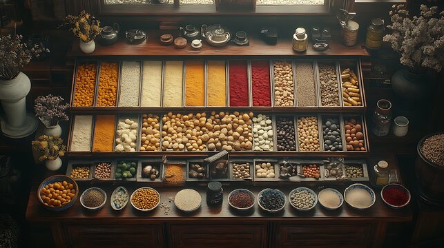 An assortment of spices and herbs on a rustic wooden board, creating a colorful and aromatic scene