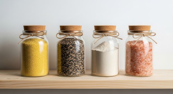 Organized pantry shelves packed with food supplies. home storage solution, simple wooden shelving