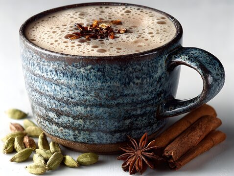 A cozy cup of spiced coffee sits on a textured surface, surrounded by aromatic spices and sweet ingredients, Ideal for blogs, recipes, or promotions related to coffee and warm beverages,