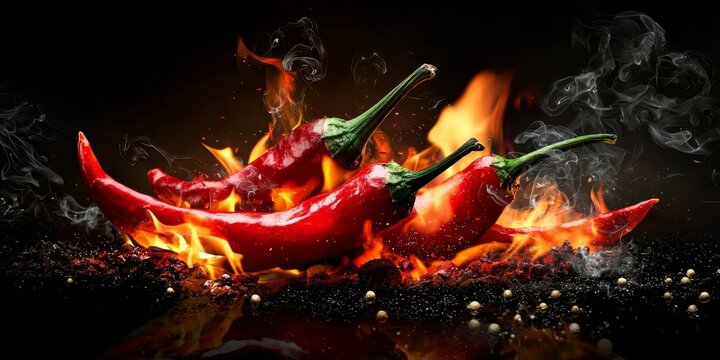 A fiery red hot chili pepper engulfed in flames against a dark backdrop.