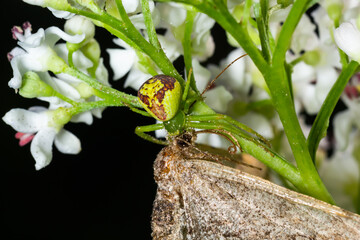 Closeup shot of the Misumena vatia (flower crab spider) on a green leaf
