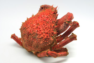 Natural coastal scene with crab on warm sandy beach surrounded by seashells and sea birds flying. Spider crab in fighting pose, Inishmore, Aran Islands, Ireland