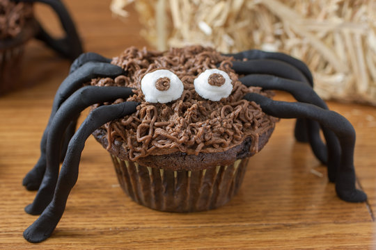 Halloween pumpkin and funny cupcakes with spiders on old rustic wooden boards. Halloween background