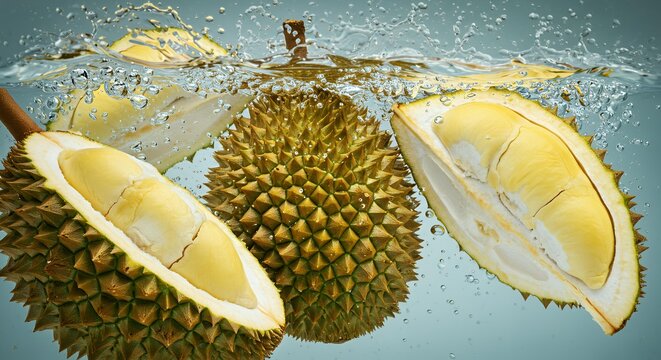 Whole durian fruit with spiky shell and opened sections showing yellow flesh underwater splash photography for tropical produce marketing