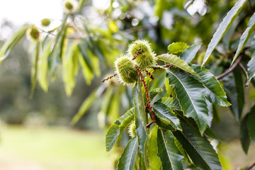 Group of two whole unpeeled autumnal green chestnut isolated on black glass