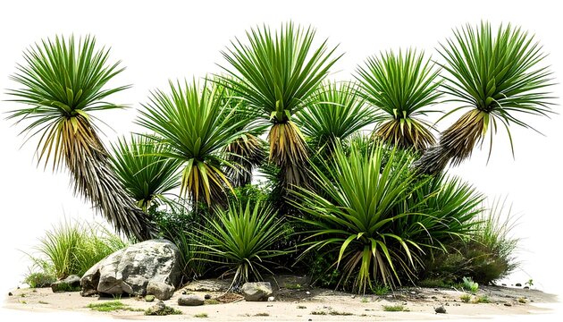 Dense yucca plants with spiky green leaves and dry brown foliage in natural setting