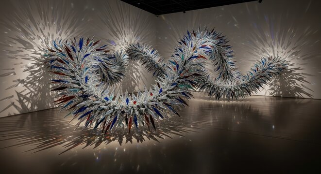 A large spiky serpentine sculpture in a modern art gallery.