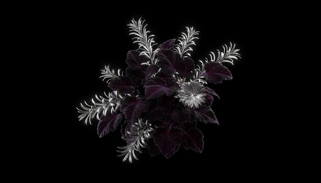 Abstract digital rendering of a dark purple and silver ornamental plant with textured leaves and spiky flower clusters against a stark black background