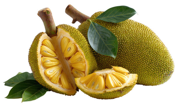 Two jackfruit halves, showcasing the interior.  Green, spiky exterior, yellow flesh.  Leaves.  Fresh.  Tropical