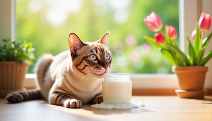 Bengal cat licking spilled milk on sunny windowsill.