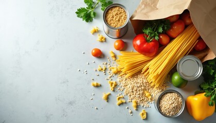 Paper grocery bag spills food on table. Fresh vegetables, pasta, grains, canned goods for cooking. Represents shopping, delivery charity donation. Set of nutritious ingredients for healthy meal, top