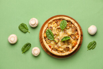 Rustic mushroom and herb savory tart with flaky fluted crust on wooden table closeup
