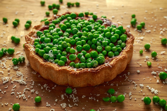 Fresh spring tart with green peas and asparagus on puff pastry