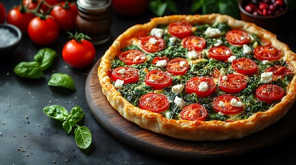 Delicious homemade tomato and spinach tart sitting on a wooden board