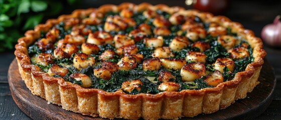 Goldencrusted spinach quiche, bathed in sunlight, rests on a wooden board
