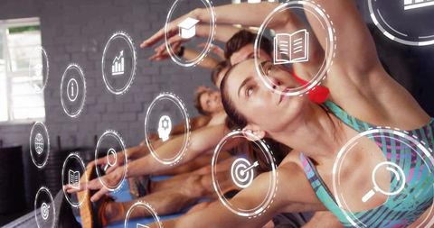 Yoga instructor guiding group through forward bend while adjusting alignment and focus