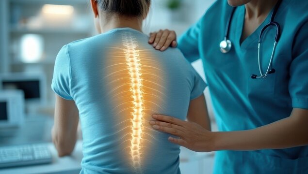 Medical professional examining patient's spine with highlighted spinal column overlay indicating focus on back health and care
