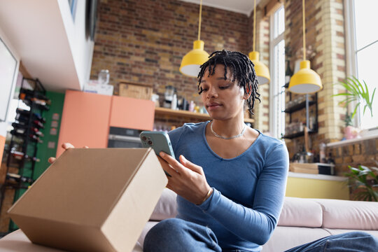Warehouse worker scanning barcode on box, Woman using barcode scanner in logistics center, Generative AI image